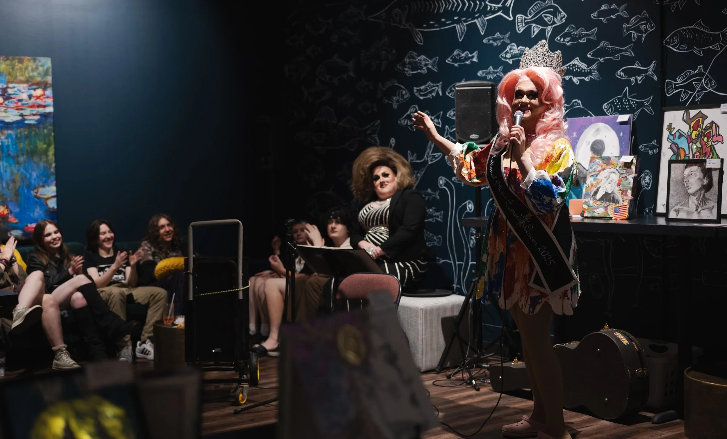 By sponsoring the Synjin Sheneman Memorial Art Show, you had the opportunity to promote your business in front of a diverse audience and show your support of the LGBTQ+ and allied community. Please consider a future donation in any amount to support the artists awards, the display, and the reception costs. Sponsors of $100 or more were honored with rainbow tabletop centerpieces at the reception and recognition by reception Master of Ceremonies drag entertainer Vivian Vendetta Sinclair. Sponsors of $100 also received a photo of Vivian holding a sign with their name or business logo.